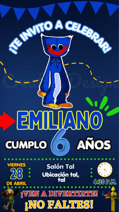 Deja que está invitación digital de Huggy Wuggy del videojuego Poppy Playtime sea partidario de invitar a los amigos del festejado de una manera original.