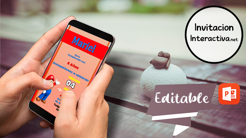 Una Invitación de Película formato PPT. Llevada a un estilo Mario Bros siendo editable acompañada de Mario en digital para imprimir.